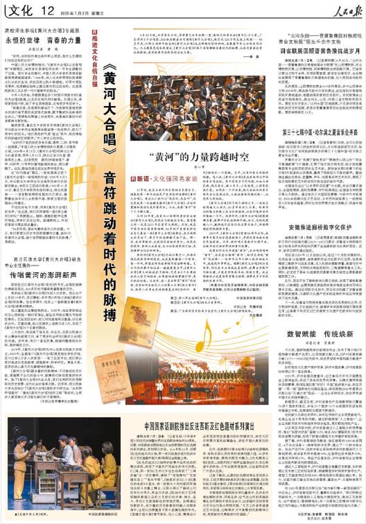 6月30日晚,北京音樂(lè)廳內(nèi),京津冀藝術(shù)家會(huì)聚一堂,奏響交響音樂(lè)會(huì)《黃河》;不久前,廣東深圳8個(gè)合唱團(tuán)、300余名歌者共同演唱《黃河大合唱》,吸引近120萬(wàn)網(wǎng)友線上觀演……80多年來(lái),從烽火硝煙中誕生的《黃河大合唱》成為跨越時(shí)空的回響,承載著中華兒女的共同記憶。從主題展覽到各類演出,《黃河大合唱》的每個(gè)音符都跳動(dòng)著時(shí)代的脈搏,讓我們重溫這首抗戰(zhàn)歌曲,感受經(jīng)典作品傳承的永恒力量。