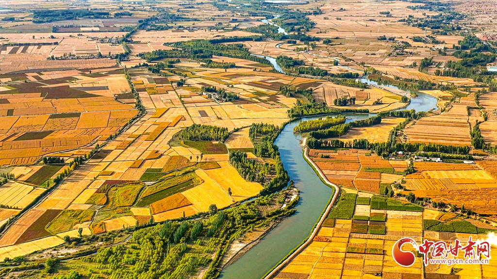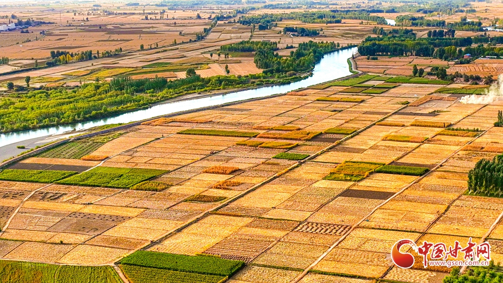 9月26日傍晚,夕陽(yáng)映照下的黑河張掖臨澤縣鴨暖鎮(zhèn)段,蜿蜒流淌的河水與兩岸鋪滿金色的大地交相輝映,盡顯盎然生機(jī),共同勾勒出一幅金秋豐收的壯美畫(huà)卷。