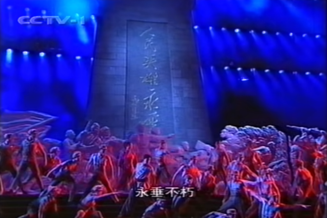 人民英雄紀(jì)念碑在舞臺(tái)上所承載的最主要的意象即歷史,而且特指1840年以后中國(guó)人民的革命歷史,其次是對(duì)英雄先烈的緬懷,演員們以解放軍裝束圍繞在人民英雄紀(jì)念碑下,呈靜默群雕的形象,姿態(tài)肅穆低垂,形成“紀(jì)念碑式”靜態(tài)場(chǎng)面,既是復(fù)刻靜止的浮雕形象,也是可供人敬仰的鮮活英雄。