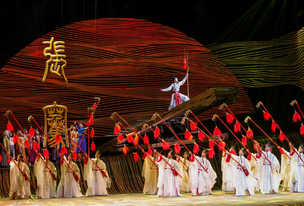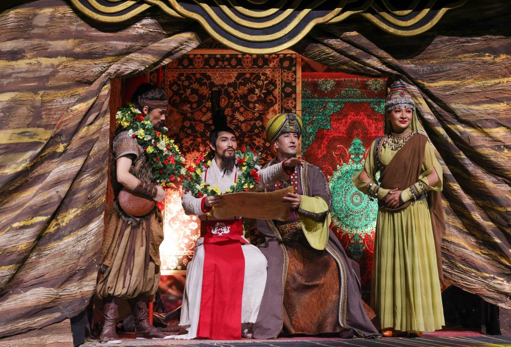 10月27日晚,在烏魯木齊文化中心大劇院,演員在舞劇《張騫》中表演。 10月27日晚,以漢代張騫出使西域為藍本創(chuàng)作的重大歷史題材舞劇《張騫》,在烏魯木齊文化中心大劇院首演。該劇由《授節(jié)》《守節(jié)》《傳節(jié)》《使節(jié)》四幕組成,演繹了張騫出使西域的“鑿空之旅”,展現(xiàn)了各民族廣泛交往、全面交流、深度交融的生動場景。 新華社記者 王菲 攝