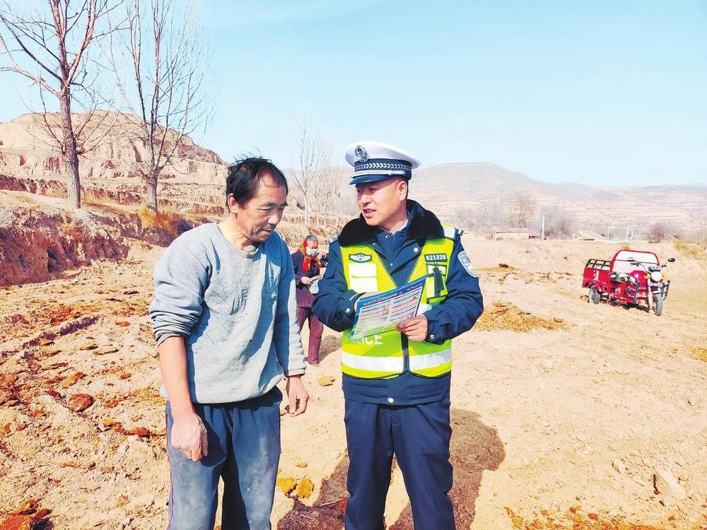 民警向群眾講解法律法規(guī)。3月10日,隴西縣公安局渭陽派出所民警深入田間地頭,開展道路交通安全和反電詐宣傳。 新甘肅·甘肅法治報(bào)通訊員劉榮攝