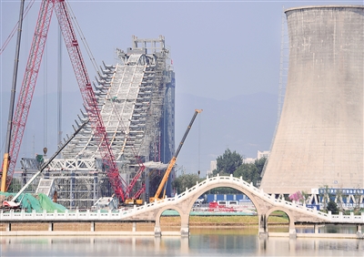 北京冬奧組委踐行節(jié)儉辦奧運(yùn),對首鋼老工業(yè)園區(qū)再利用,建成滑雪大跳臺等競賽場館?;┐筇_是冬奧歷史上第一座與工業(yè)遺產(chǎn)再利用直接結(jié)合的競賽場館。圖為2019年7月工人在改造滑雪大跳臺。新華社記者 張晨霖 攝