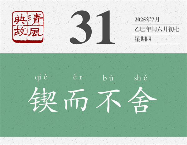 這段話中,為后人貢獻(xiàn)了好幾個(gè)典故,一個(gè)是“跬步千里”,一個(gè)是“鍥而不舍”。前者從“不積跬步,無(wú)以至千里”而來(lái),不過(guò)只是反其意而用之,意思是,只要一步一步走下去,就能達(dá)到千里之遠(yuǎn)。后者是從“鍥而不舍,金石可鏤”而來(lái),意思非常清楚:一直雕刻而不停止,即使一塊金石也能雕刻成器。后即以“鍥而不舍”比喻有恒心,有毅力。章炳麟《菌說(shuō)》:“夫固謂一人鍥而不舍,則行美于本性矣。”