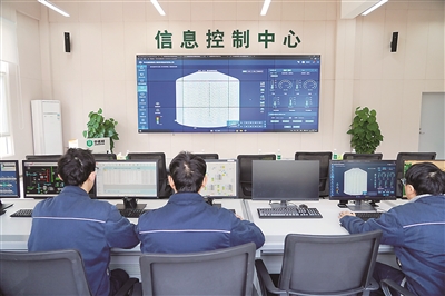 圖①:在中儲(chǔ)糧四川新津直屬庫(kù)信息控制中心,倉(cāng)儲(chǔ)保管員通過(guò)在線監(jiān)控系統(tǒng)查看倉(cāng)儲(chǔ)作業(yè)情況。