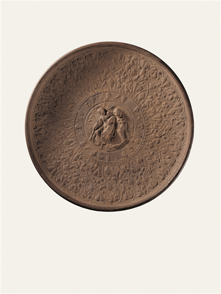 公元2-3世紀(jì),靖遠(yuǎn)縣征集,高4.6厘米,口徑31厘米,足徑10.9厘米。銀質(zhì)鎏金,以鑄造、錘鍱等工藝制成,鎏金已大部脫落。圓形,卷唇,斜孤壁,圈足。盤內(nèi)壁滿飾浮雕花紋,分3圈列置。外圈飾勾聯(lián)的葡萄卷草紋藤蔓,其間棲息30余只禽鳥等動(dòng)物。中圈外緣飾細(xì)小聯(lián)珠紋,內(nèi)周環(huán)列12個(gè)頭像,頭像間為禽鳥等動(dòng)物,或?yàn)橄ED神話中的奧林匹斯山12神。中心為一高浮雕裸體男性,卷發(fā)無(wú)須,身披長(zhǎng)巾,右手持圖爾索斯杖,杖首為松果狀飾物,為希臘神話中的酒神狄俄尼索斯。酒神倚一花豹而坐,鼻梁凸出,側(cè)首張口,頸下帶花環(huán),身上遍布圓斑。盤底圈足內(nèi)有一行刻作虛點(diǎn)的銘文,銘文年代晚于做器年代。此件器物發(fā)現(xiàn)于絲綢之路甘肅段的黃河渡口,是研究中西交流重要的實(shí)物資料,也是十分罕見(jiàn)的絲綢之路遺珍。