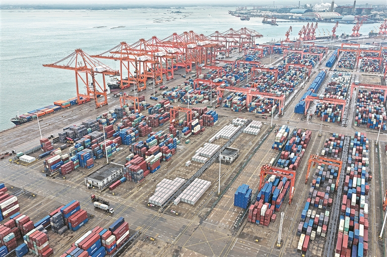 時下,廣西北部灣港欽州港區(qū)碼頭橋吊、龍門吊等自動化設備有序運轉(zhuǎn),車輛來往穿梭,港口貨運呈現(xiàn)一派繁忙景象。圖為3月4日拍攝的廣西北部灣港欽州港區(qū)碼頭。新華社記者 周華 攝