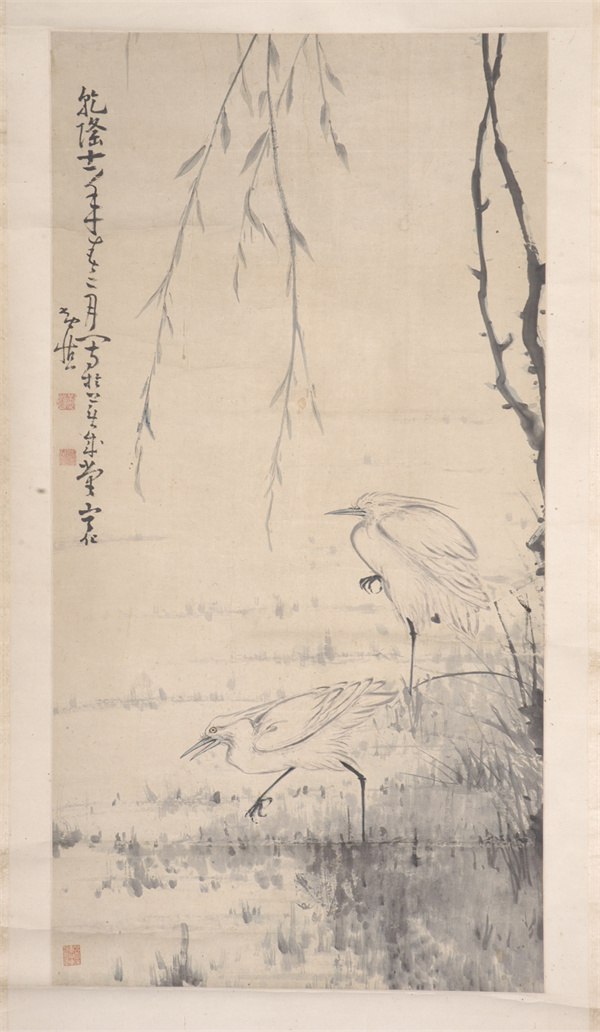 清代,水墨設(shè)色花鳥(niǎo)畫(huà)立軸,紙本,作者黃慎??v高1126厘米,橫寬57.4厘米??钍?ldquo;乾隆十一年春二月寫(xiě)于蕪成堂寧化黃慎”。鈐“黃慎”白文方印,“癭瓢”白文方印。柳枝自畫(huà)面上方垂下,疏落的柳葉隨風(fēng)搖曳。池塘兩只白鷺,一只閉目獨(dú)立,一只行走覓食。黃慎,福建寧化人,書(shū)畫(huà)家,為“揚(yáng)州八怪”之一。