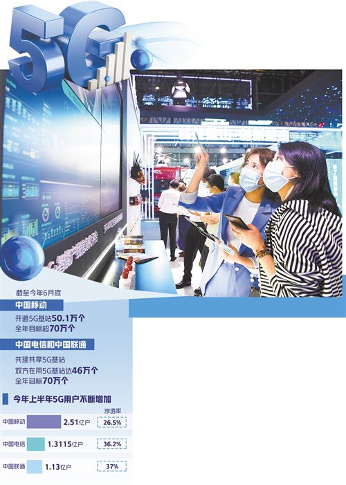 從5G基站看,截至今年6月底,中國移動(dòng)已開通5G基站50.1萬個(gè),全年目標(biāo)超過70萬個(gè);中國電信和中國聯(lián)通共建共享5G基站,目前雙方在用5G基站達(dá)46萬個(gè),全年目標(biāo)也是70萬個(gè)。工信部數(shù)據(jù)顯示,截至今年6月底,我國累計(jì)建設(shè)5G基站96.1萬個(gè),覆蓋全國所有地級以上城市,5G手機(jī)終端連接數(shù)達(dá)3.65億戶,占全球80%以上。