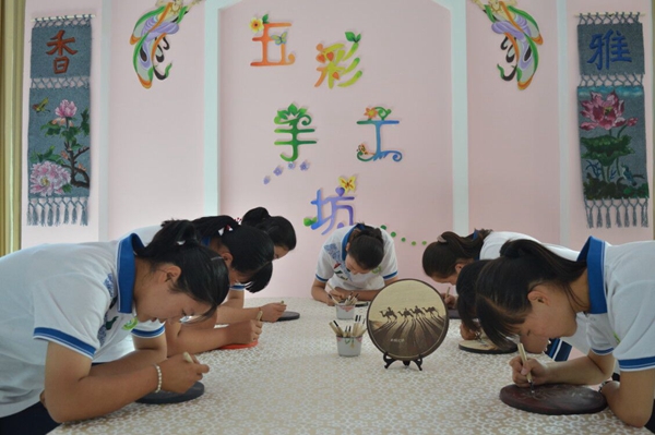 敦煌市黃渠中學學生學習木板雕刻畫。敦煌市委宣傳部供圖