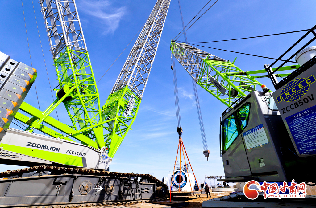 2月21日,張掖市臨澤縣平川北灘30萬千瓦風電項目建設(shè)現(xiàn)場,工作人員正在進行主機吊裝。