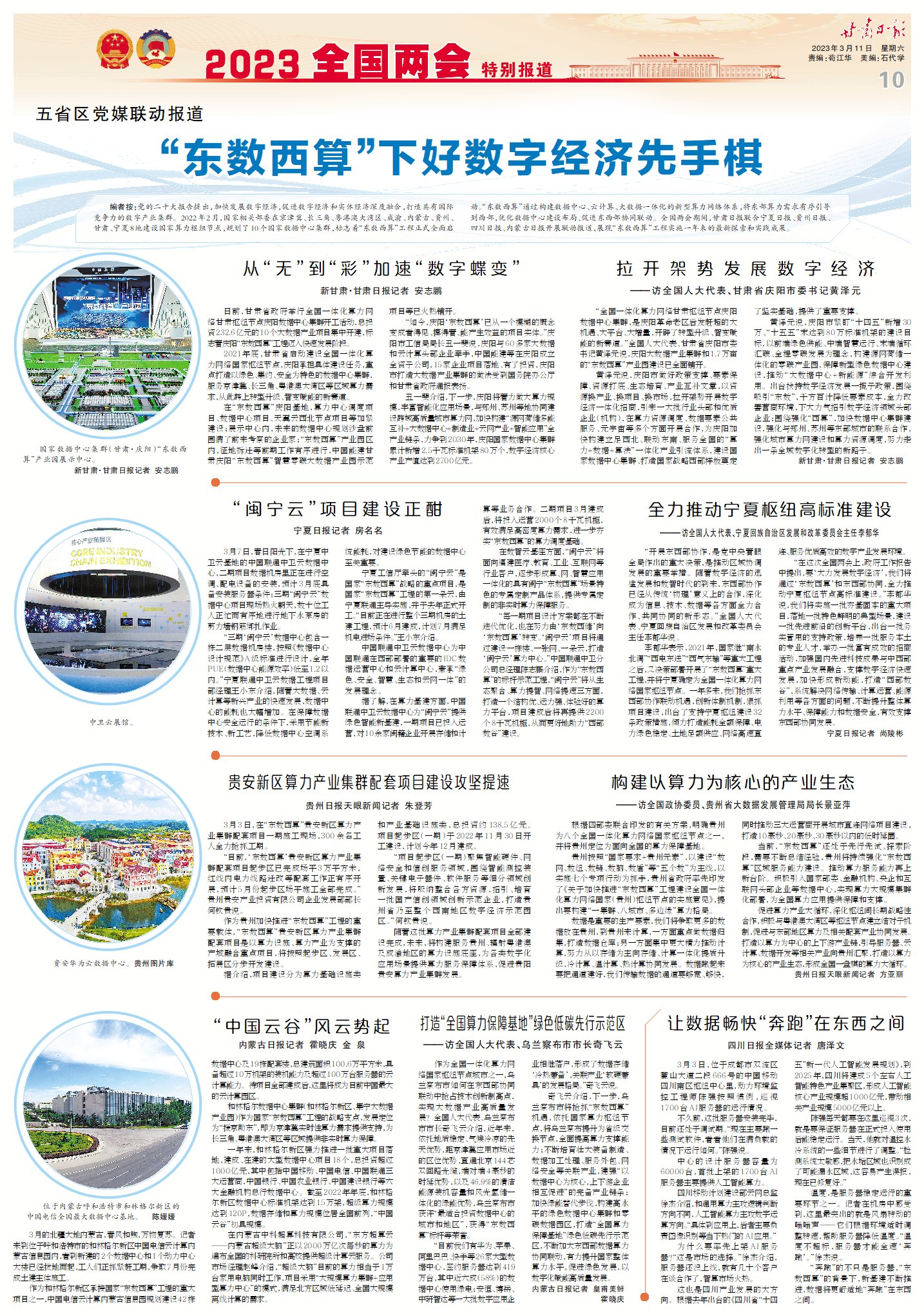 編者按:黨的二十大報告提出,加快發(fā)展數(shù)字經(jīng)濟,促進數(shù)字經(jīng)濟和實體經(jīng)濟深度融合,打造具有國際競爭力的數(shù)字產(chǎn)業(yè)集群。2022年2月,國家相關(guān)部委在京津冀、長三角、粵港澳大灣區(qū)、成渝、內(nèi)蒙古、貴州、甘肅、寧夏8地建設(shè)國家算力樞紐節(jié)點,規(guī)劃了10個國家數(shù)據(jù)中心集群,標(biāo)志著“東數(shù)西算”工程正式全面啟動。“東數(shù)西算”通過構(gòu)建數(shù)據(jù)中心、云計算、大數(shù)據(jù)一體化的新型算力網(wǎng)絡(luò)體系,將東部算力需求有序引導(dǎo)到西部,優(yōu)化數(shù)據(jù)中心建設(shè)布局、促進東西部協(xié)同聯(lián)動。全國兩會期間,甘肅日報聯(lián)合寧夏日報、貴州日報、四川日報、內(nèi)蒙古日報開展聯(lián)動報道,展現(xiàn)“東數(shù)西算”工程實施一年來的最新探索和實踐成果。