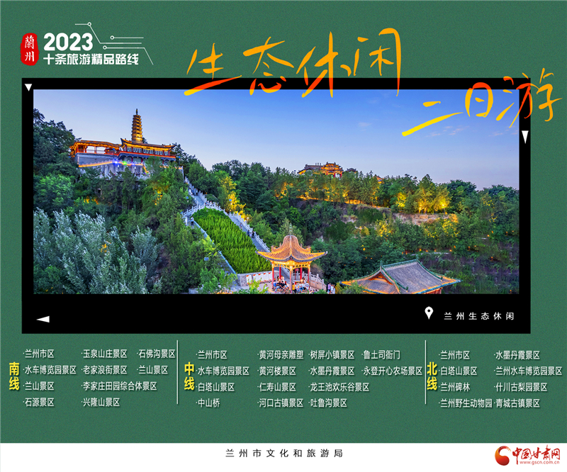 3.蘭州生態(tài)休閑2日游。這里有蘭山景區(qū),泡一壺茗茶覽金城夜景;這里有玉泉山莊,約三兩摯友慢品農(nóng)家風(fēng)味;這里有李家莊田園綜合體,瓜田李下享天倫之樂(lè);或者直接遁入興隆山,隱入深山自逍遙,當(dāng)半日山居隱士。“蘭州生態(tài)休閑2日游”三條線(xiàn),分別為南線(xiàn)、中線(xiàn)和北線(xiàn)。