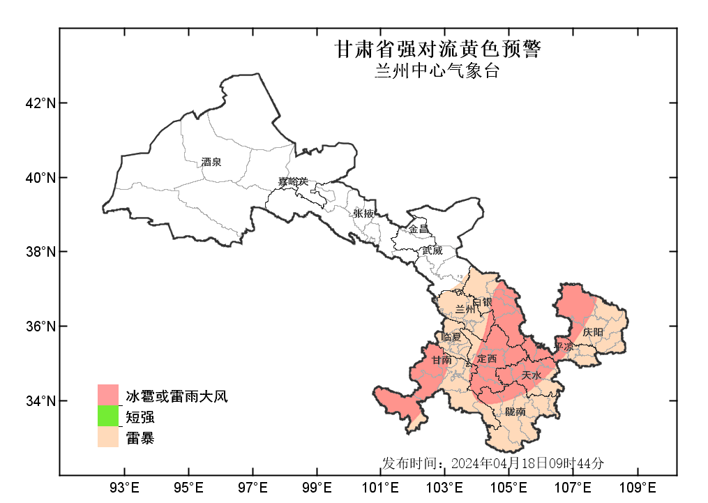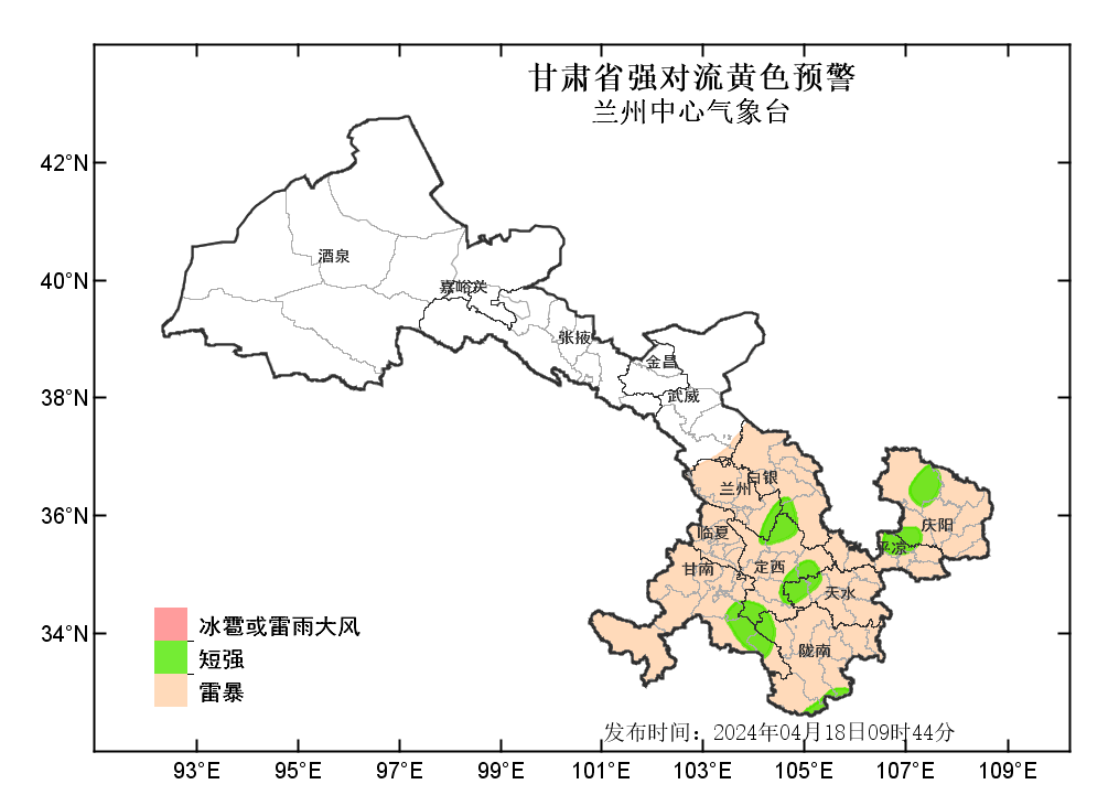 中國甘肅網(wǎng)4月18日訊(西北角·中國甘肅網(wǎng)記者 沈文剛)4月18日9時44分,蘭州中心氣象臺發(fā)布強(qiáng)對流黃色預(yù)警:預(yù)計今天白天到夜間,武威以東大部分地方有雷暴;其中,白銀、定西、甘南、天水等市州部分地方及蘭州、隴南、平?jīng)?、慶陽等市局部地方有雷雨大風(fēng)或冰雹;甘南、隴南、定西、天水、白銀、蘭州、平?jīng)?、慶陽等州市局部地方有短時強(qiáng)降水,最大小時雨強(qiáng)為20-30毫米。