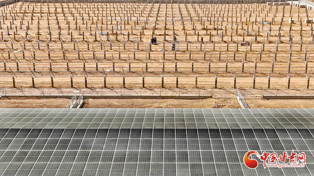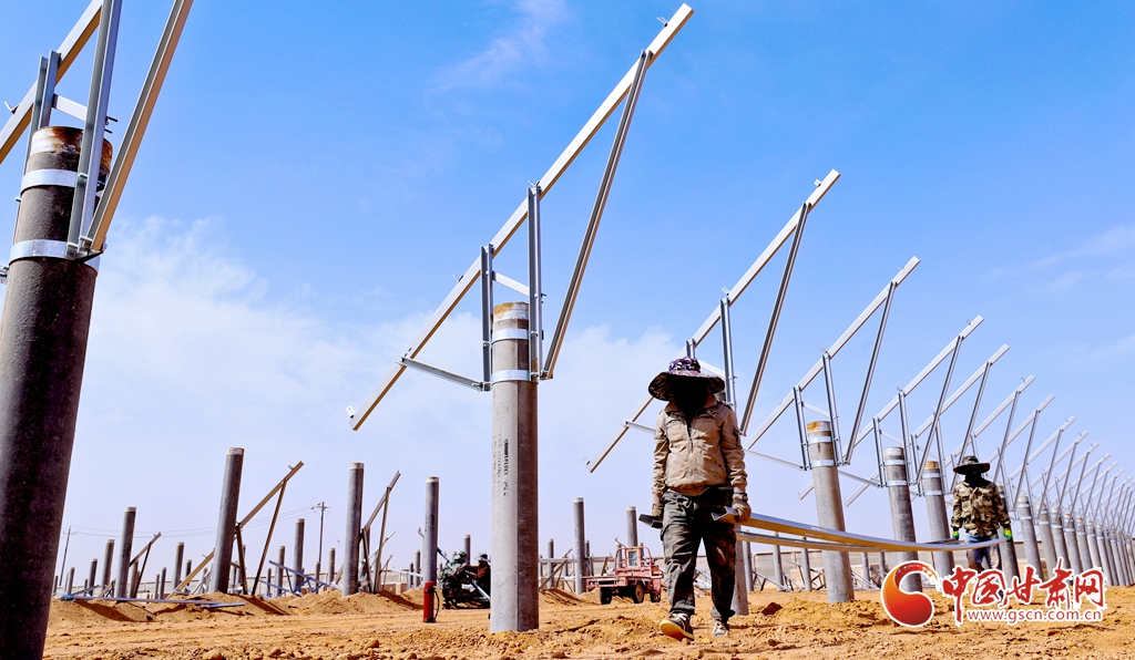4月15日,甘肅省張掖市臨澤縣板橋鎮(zhèn)一養(yǎng)殖場工地上,工程建設(shè)者們正在安裝光伏板。