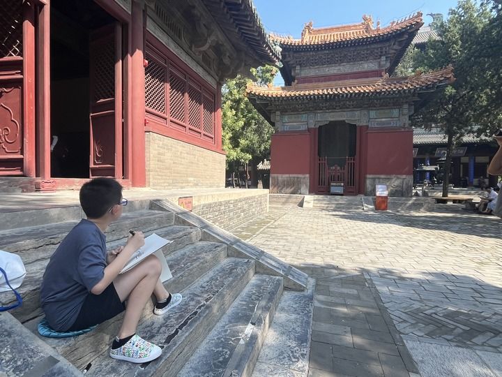 夜幕低垂,華燈初上,身著漢服的女孩徐行古跡之間。烈日當(dāng)頭,少年定坐在古老建筑旁安靜臨摹,筆下的雕梁畫棟多了樸拙意趣。“正定的古建筑很美,畫之前要細(xì)細(xì)觀察,但不能原封不動地畫。畫得好,就很滿意、很開心。”今年12歲、從北京前來研學(xué)的米騰飛說。