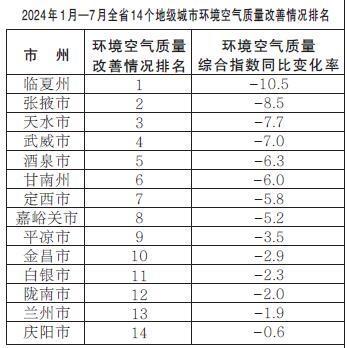 2024年1月—7月,全省14個(gè)地級(jí)城市環(huán)境空氣質(zhì)量改善情況排名由好到差分別為:臨夏州、張掖市、天水市、武威市、酒泉市、甘南州、定西市、嘉峪關(guān)市、平?jīng)鍪小⒔鸩?、白銀市、隴南市、蘭州市、慶陽(yáng)市。