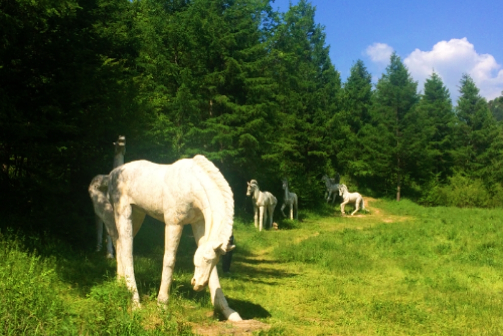 在碧草連天的谷地,當(dāng)?shù)芈糜尾块T擺放了一組白馬的大型雕塑,栩栩如生,它們要么仰天長嘶,要么低首撫弄地上的青草,還有的彼此耳鬢廝磨,像是親密的戀人。