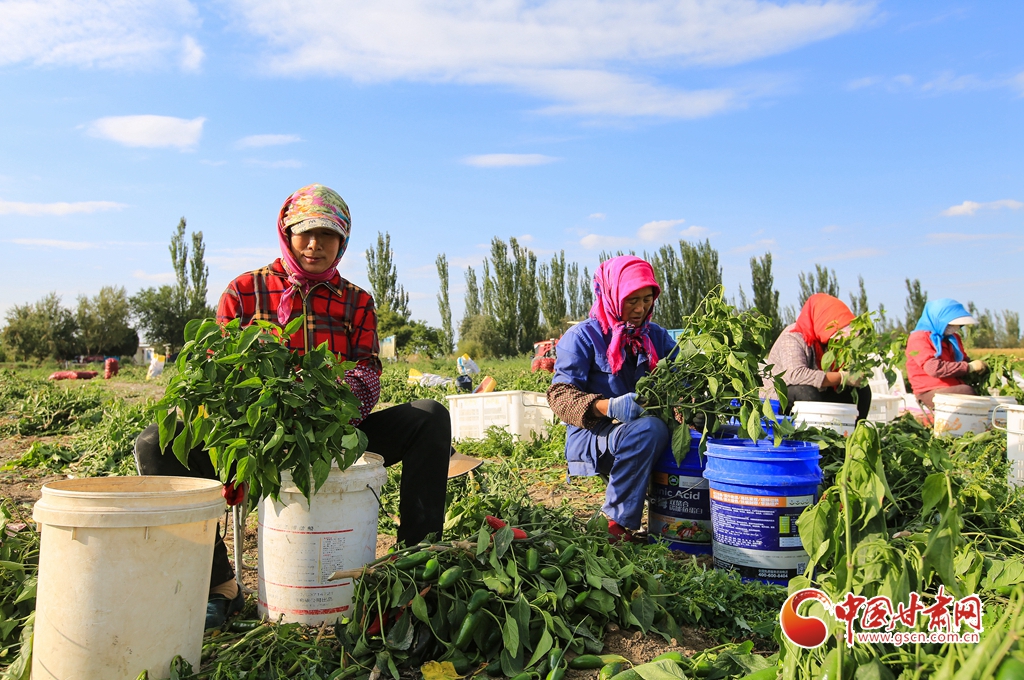 9月1日,嘉峪關(guān)市新城鎮(zhèn)長(zhǎng)城村一農(nóng)民專業(yè)合作社種植的子彈頭辣椒喜獲豐收,種植戶搶抓農(nóng)時(shí)采摘,農(nóng)用機(jī)械車輛穿梭于田間地頭,鄉(xiāng)村田野呈現(xiàn)出一派繁忙的景象。