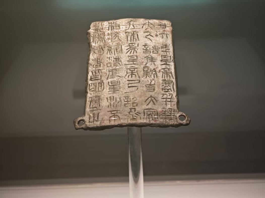 “鎮(zhèn)原縣博物館的鎮(zhèn)館之寶是秦二十六年銅詔版,1976年 4月 1日被鎮(zhèn)原縣城關(guān)鎮(zhèn)富坪村建宅取土的農(nóng)民發(fā)現(xiàn)并上交。在1996年 9月,國家文物局鑒定專家組定為國家一級文物。這塊銅詔版上有文字5 行,共40字,字跡清晰,線條纖細(xì),字體為小篆。在用筆結(jié)構(gòu)上既有秦代小篆規(guī)矩整飭的風(fēng)范,又保留著大篆文字的某些特點。”鎮(zhèn)遠(yuǎn)縣博物館講解員介紹道。