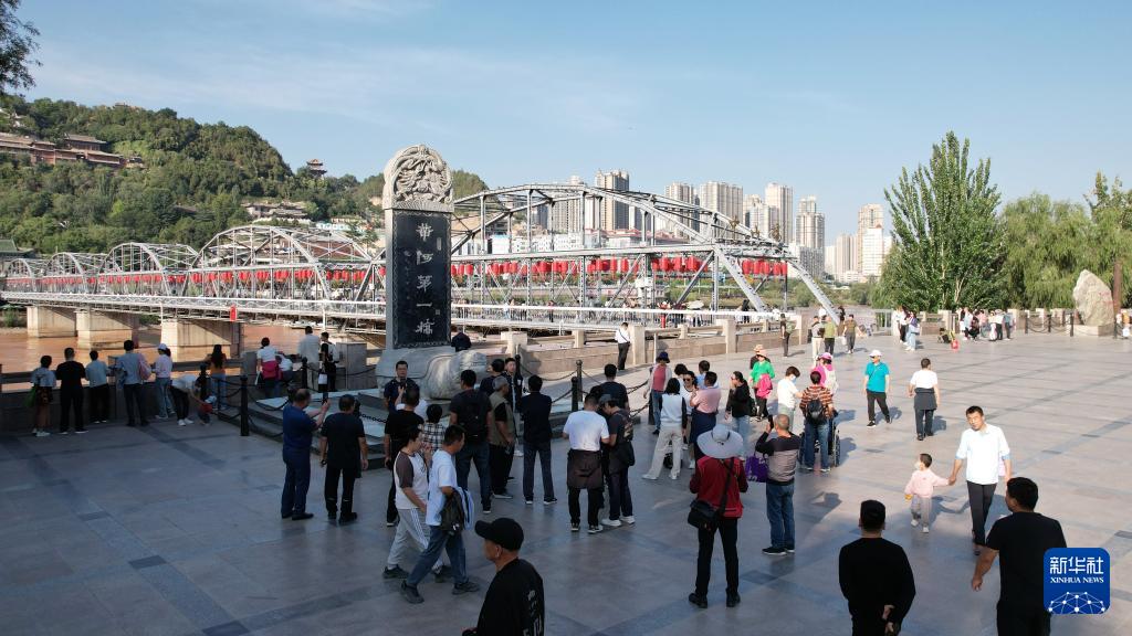 游客在蘭州地標(biāo)——中山橋參觀(guān)游覽(9月23日攝,無(wú)人機(jī)照片)。新華社記者陳斌攝