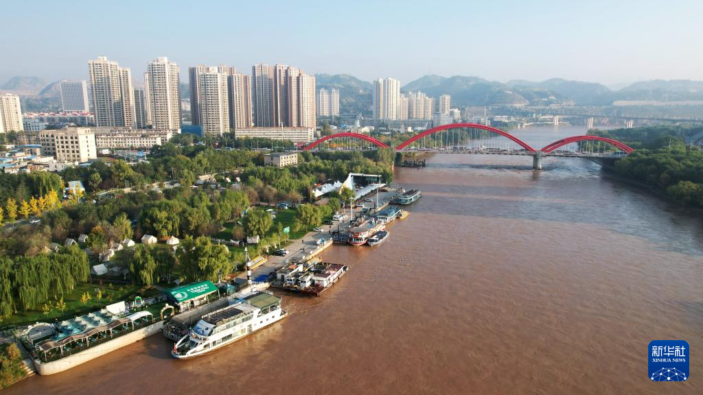 這是位于蘭州市城關(guān)區(qū)黃河北岸的鹽場(chǎng)堡碼頭(10月17日攝,無(wú)人機(jī)照片)。新華社記者陳斌攝