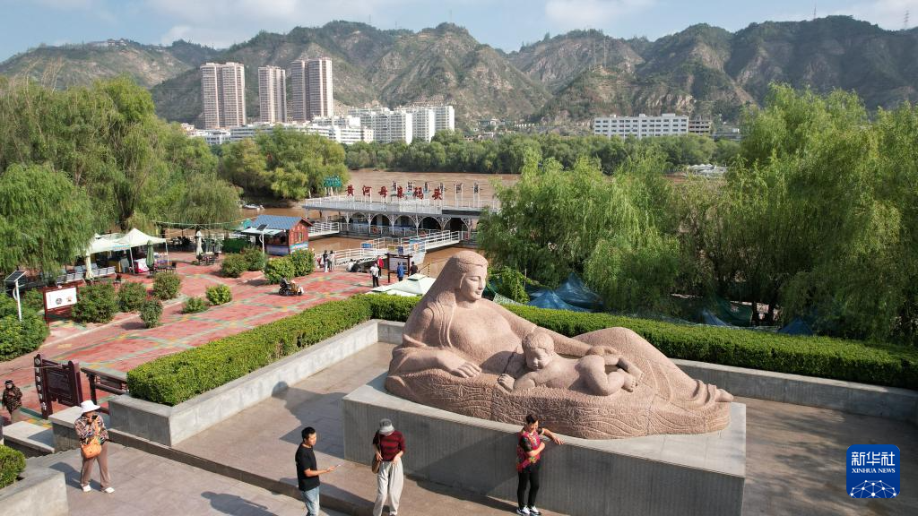 游客在位于黃河蘭州段南岸的黃河母親雕像參觀(guān)游覽(9月25日攝,無(wú)人機(jī)照片)。新華社記者陳斌攝