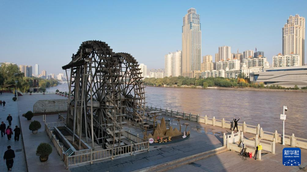 這是黃河蘭州段南岸的水車(chē)(10月17日攝,無(wú)人機(jī)照片)。新華社記者陳斌攝