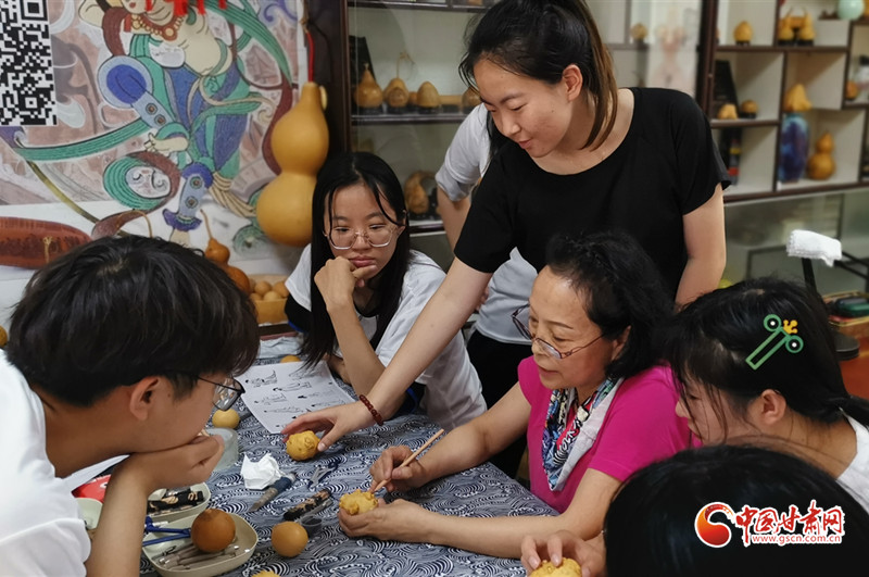 她還走進(jìn)蘭州開(kāi)放大學(xué),為熱愛(ài)刻葫蘆的老年人手把手地傳授技藝,耐心細(xì)致地指導(dǎo)他們?nèi)绾卧谛⌒〉暮J上刻畫(huà)出精美的圖案。