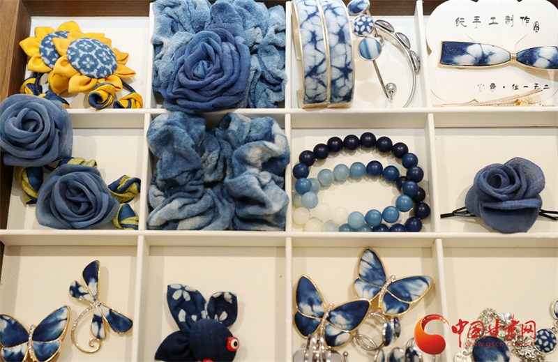 染好的布匹還要經(jīng)過(guò)脫漿、清洗、陰干,最后才是拆線、整理。當(dāng)一塊完整的藍(lán)印花布展現(xiàn)在眼前時(shí),李梅總會(huì)輕輕撫摸布料,仿佛在與草木對(duì)話。她的工作室里,掛滿了用藍(lán)染制成的物件:桌布上印著成片的板藍(lán)根葉,茶席邊緣綴著小巧的藍(lán)染布扣,就連她日常穿的棉麻衫,也是自己染的淡藍(lán)色。“這些布不是冰冷的商品,是帶著土地溫度的生活。”李梅說(shuō),去年她在平?jīng)龉懦情_(kāi)了一間“藍(lán)染生活館”,游客可以跟著她學(xué)種板藍(lán)根、體驗(yàn)扎染,很多人第一次發(fā)現(xiàn),原來(lái)衣服上的藍(lán)色可以來(lái)自田野,非遺技藝能如此貼近日常。