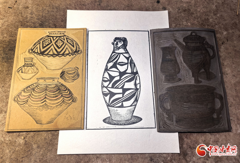 當(dāng)被問及甘肅版畫與敦煌壁畫、彩陶藝術(shù)等本土文化是否存在傳承關(guān)系時(shí),趙寧坦言,甘肅古代彩陶藝術(shù)對他的創(chuàng)作影響深遠(yuǎn)。他指著工作室里的《敦煌壁畫·菩薩·飛天》《甘肅彩陶系列版畫》等作品介紹:“在題材選擇與表現(xiàn)形式上,甘肅版畫充分汲取了本土傳統(tǒng)文化的精髓。你看,千年彩陶上的紋樣、飛天神女的飄逸姿態(tài),都被巧妙地融入刀刻之中,讓這些古老符號在新時(shí)代煥發(fā)出新的生機(jī)與活力。”