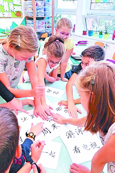 在匈牙利首都布達佩斯,匈中雙語學校的學生在課堂上復習漢語生詞。新華社發(fā)