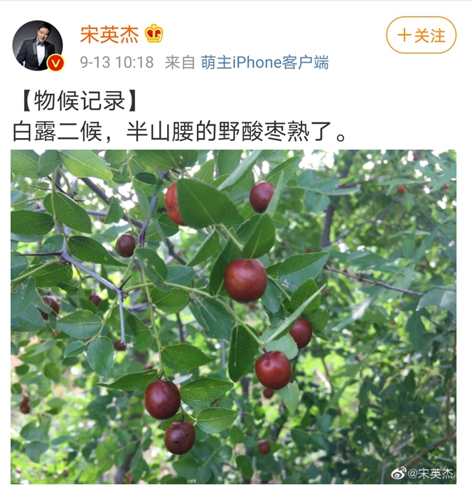 如今,他仍然會隨手在社交媒體上記錄四時風物的變化,前幾天發(fā)了一張照片,配文“白露二候,半山腰的野酸棗熟了。”對他而言,隨時關注氣候與物候,已經成為一種習慣。(完)