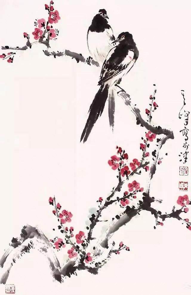 那是我第一次看見梅花,墨黑的枝干上,稀稀疏疏臥著幾朵紅紅的梅花,很安靜。畫上有四個(gè)字:傲雪紅梅。兩邊還有對(duì)聯(lián),內(nèi)容已經(jīng)不記得了。正值外面大雪紛飛,院子里已落了一層白白的積雪,一時(shí)間詩意悠然。對(duì)著那副梅花圖,清清爽爽的,令人內(nèi)心好快樂。那時(shí),我在讀《紅樓夢(mèng)》,只記住了那句:琉璃世界白雪紅梅。