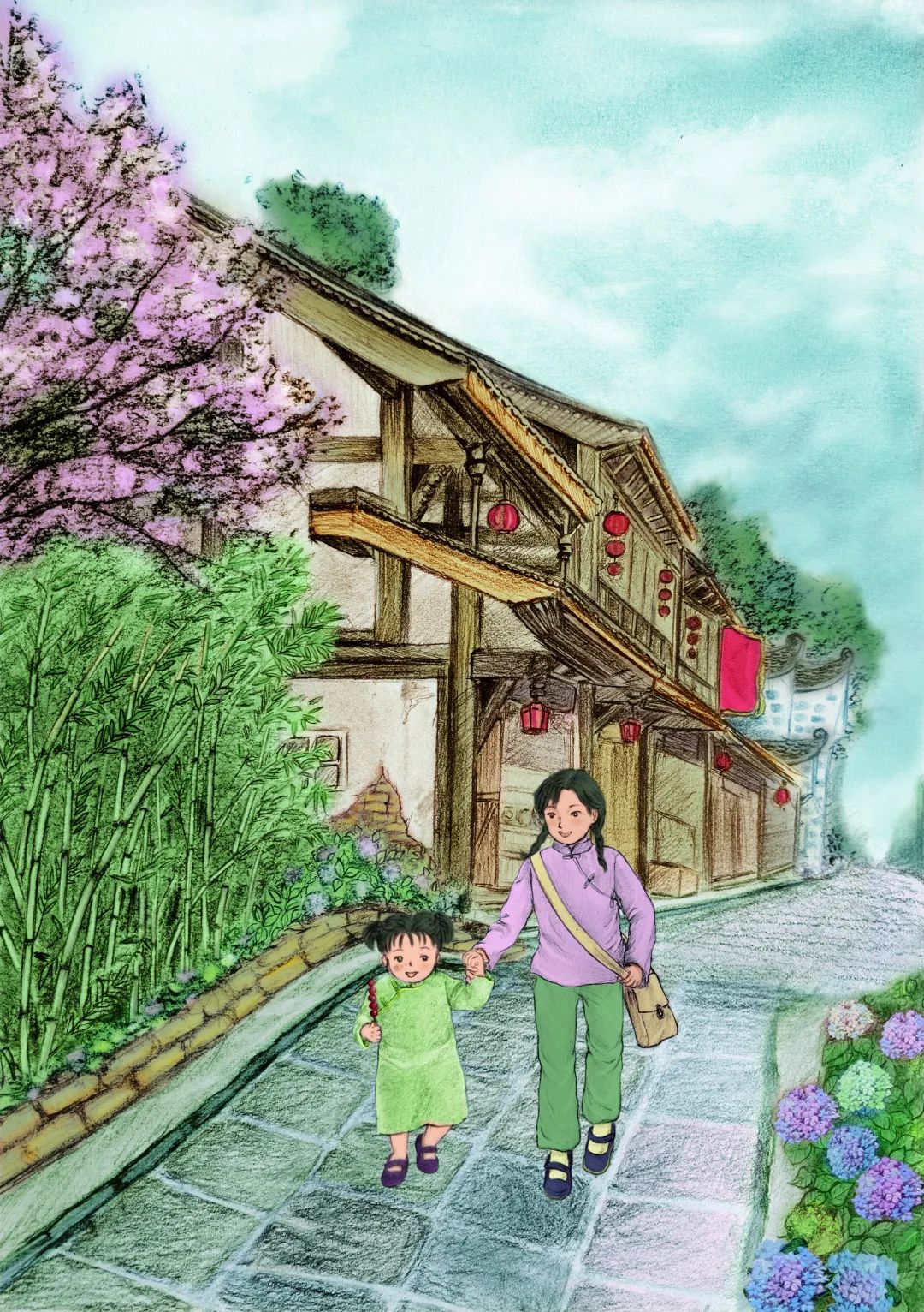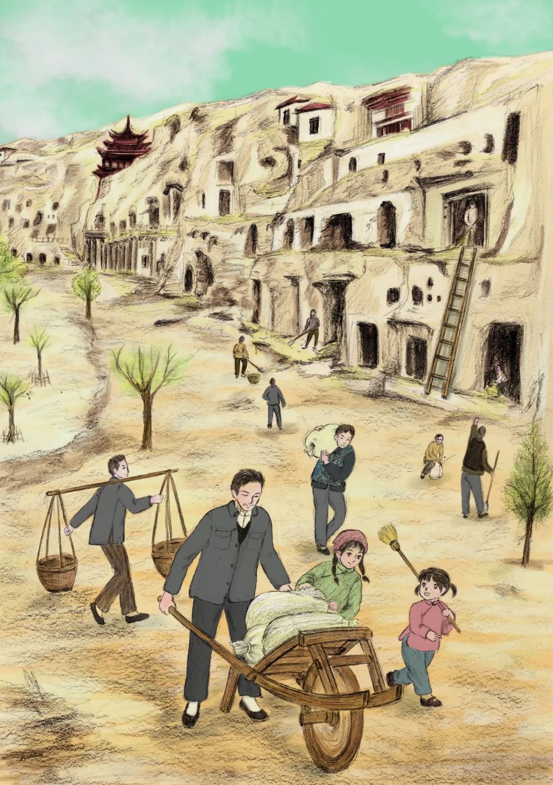 《敦煌小畫師》的故事,以民國時(shí)候國立敦煌研究所初創(chuàng)時(shí)期為背景,以一個(gè)小女孩欣潔的眼光,摹刻了一群以敦煌為文化藝術(shù)圣地而奮斗而獻(xiàn)身的藝術(shù)家和學(xué)者群體,這個(gè)群體以欣潔的父親為代表,他們舍棄溫暖濕潤的家鄉(xiāng),而遠(yuǎn)赴那個(gè)遙遠(yuǎn)荒涼的所在。因?yàn)槟抢镉卸鼗?,因?yàn)槟抢锉4嬷磺Ф嗄昵暗恼滟F文物和彩塑壁畫,還因?yàn)槟抢锛毙栌腥藖肀Wo(hù)、修復(fù)和弘揚(yáng)。他們來了,他們?cè)谶@片戈壁之地安家扎根,在動(dòng)蕩的社會(huì)時(shí)局下開始了為家為國的擔(dān)當(dāng),也開始了人生理想和價(jià)值的實(shí)現(xiàn)。這一切,以一個(gè)孩子的眼光來看,幾乎就是交織著欣喜和失望、歡喜與憂愁,從茫然無知到誠摯熱愛的一段生動(dòng)故事?!抖鼗托‘嫀煛饭适虑楣?jié)的設(shè)定,有起伏有高潮,有親情之愛,有田野之趣,更有人與人之間和諧相助的人性之美,讀起來有聽一首鄉(xiāng)村音樂的韻律感。我覺得,一部優(yōu)秀的兒童文學(xué)作品,應(yīng)該就是這個(gè)樣子。