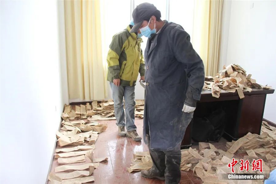 挖掘工作持續(xù)了3天才結(jié)束。由于當(dāng)時寺院條件簡陋,古籍散葉被臨時裝入編織袋中,足足裝滿了68袋。