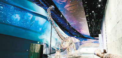 進(jìn)入展廳,人們首先會(huì)被來(lái)自侏羅紀(jì)時(shí)代的龐然大物——中加馬門溪龍化石所震撼。馬門溪龍是中國(guó)發(fā)現(xiàn)的體型最大的蜥腳類恐龍之一,頸部特別長(zhǎng)。這具化石出土于新疆奇臺(tái)縣,2016年修復(fù)裝架完成,高7.5米,長(zhǎng)24米,脖子就有12米長(zhǎng)。