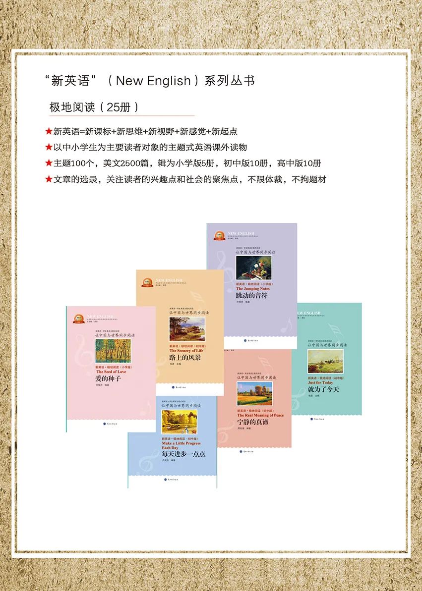 涉及與中小學生學習、生活、成長密切關(guān)聯(lián)的主題100個、美文2500篇,并依照難易梯度,輯為小學版5本,初中版10本,高中版10本。