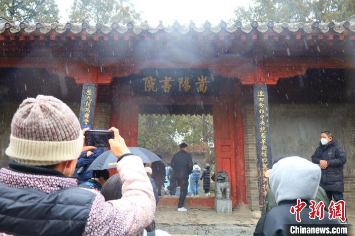 中新網(wǎng)鄭州2月23日電 (王迪)春雪依依,古柏森森,紅墻青瓦間傳出幾句儒家經(jīng)典的吟誦之聲……在22日的“寫意中國——探訪漢字起源”主題宣傳采訪中,記者探訪了河南登封市區(qū)北約二公里處嵩山南麓的嵩陽書院。是日清晨,登封忽降細(xì)雪,映襯得整個(gè)嵩陽書院愈發(fā)肅穆。美景難得,引得游人紛紛駐足欣賞,拍照留念。
