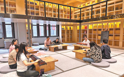 圖為讀者在沈陽老北市漢字主題書房學(xué)習(xí)彈奏古琴。記者 胡婧怡攝