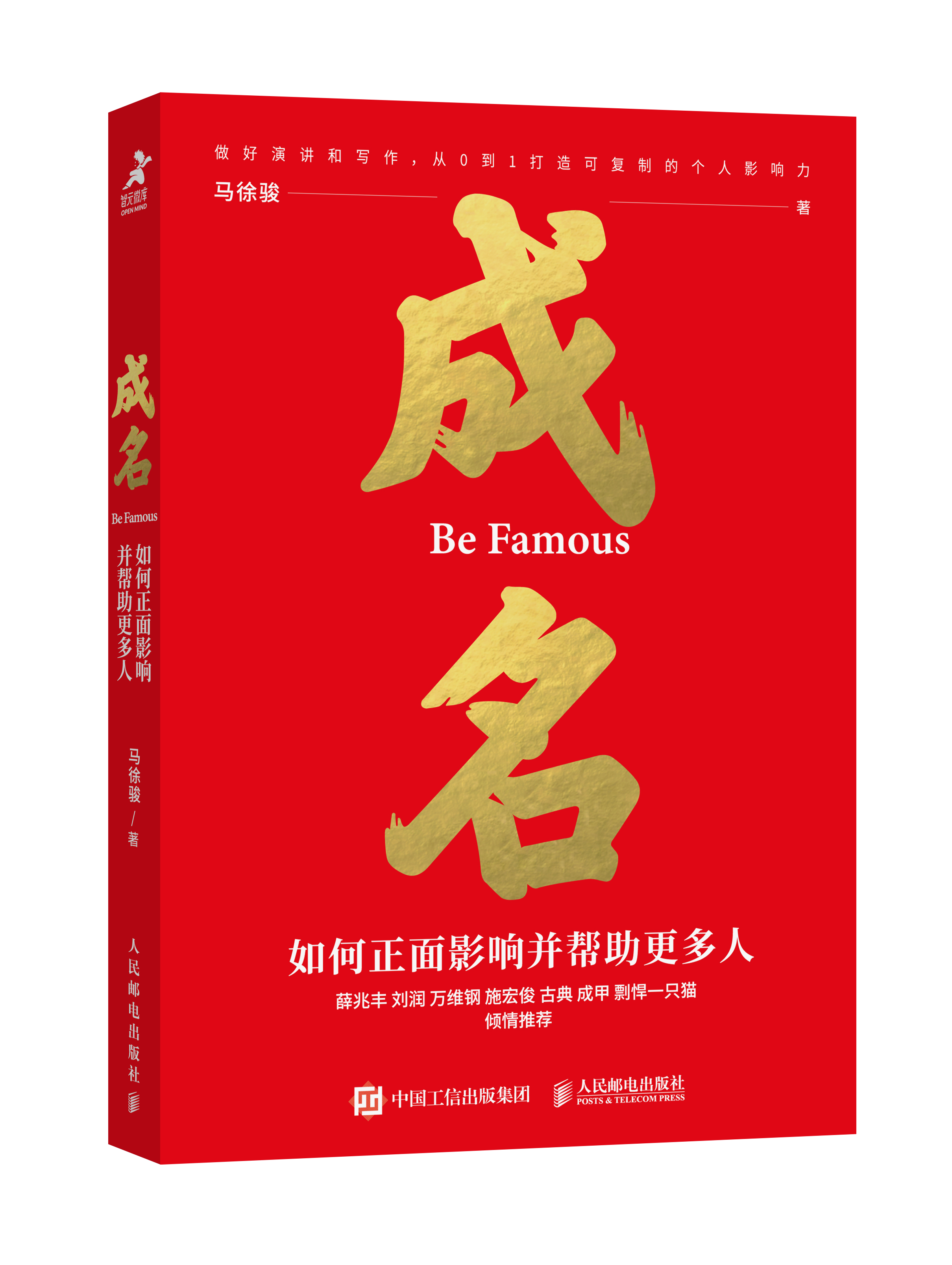 《成名》是一本看得懂、學(xué)得會(huì)、用得上的個(gè)人影響力打造手冊(cè),展示了馬徐駿對(duì)打造好演講、寫出好文章的心得和路徑,有助于提升個(gè)人及團(tuán)隊(duì)內(nèi)容造詣,通過演講、寫作放大聲量,正確借助名望正面影響并幫助更多人。