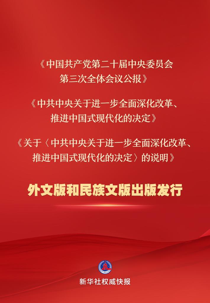 《中國共產(chǎn)黨第二十屆中央委員會第三次全體會議公報》《中共中央關于進一步全面深化改革、推進中國式現(xiàn)代化的決定》《關于<中共中央關于進一步全面深化改革、推進中國式現(xiàn)代化的決定>的說明》的英文、法文、西班牙文、日文、俄文、德文、阿拉伯文、葡萄牙文、越南文、老撾文等10種外文版已由中央編譯出版社、外文出版社出版,面向國內外公開發(fā)行。