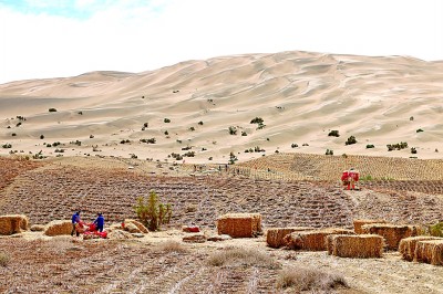 近年來,莫高窟已經(jīng)逐漸形成風(fēng)沙危害綜合防護體系,有效減輕了風(fēng)沙對石窟的影響。圖為7月23日,在莫高窟的崖頂上,工作人員正在鋪設(shè)草方格固沙。