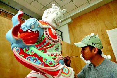 7月25日,雕塑師付祥波在敦煌研究院雕塑室內(nèi)為塑像臨摹品上色。