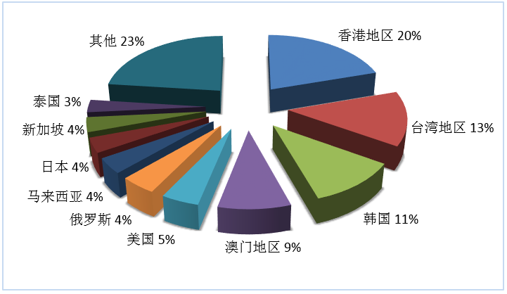 第三季度旅行社入境旅游接待人次排名前十位的客源地國(guó)家或地區(qū)由高到低依次為香港地區(qū)、臺(tái)灣地區(qū)、韓國(guó)、澳門地區(qū)、美國(guó)、俄羅斯、馬來(lái)西亞、日本、新加坡、泰國(guó)(見圖2)。