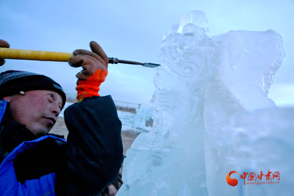 春節(jié)將近,甘肅省張掖市甘州區(qū)屋蘭古鎮(zhèn)九曲黃河燈陣景區(qū)的冰雕工藝師們加班加點趕制愛國主義教育、長城、絲綢之路盛景、人們幸福美好生活等大型主題冰雕,在即將到來的春節(jié)為游客和市民展現(xiàn)精美的冰雕藝術(shù)大餐。