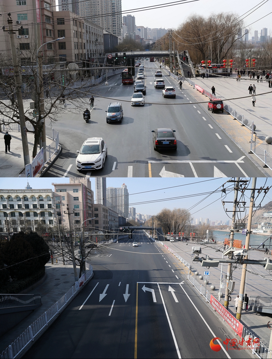 3月3日(圖上)與2月4日(圖下)拍攝的蘭州中山路