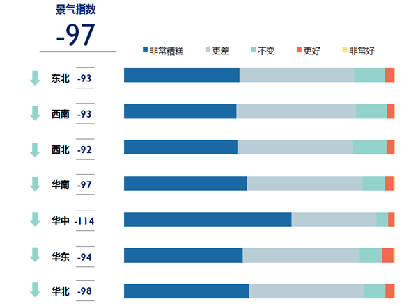 《報告》稱,受疫情影響,全國各地對于旅游到訪目的地的景氣預(yù)期同樣極度消極,7大地區(qū)市場的平均景氣指數(shù)跌至-97。其中,受疫情影響最為嚴(yán)重的華中地區(qū)景氣指數(shù)最低。同樣的,目的地景氣指數(shù)也表現(xiàn)出疫情影響越嚴(yán)重,指數(shù)表現(xiàn)越低的趨勢。