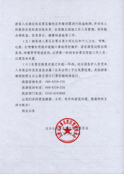 五臺山風(fēng)景名勝區(qū)強(qiáng)調(diào),恢復(fù)開放期間,五臺山將對景區(qū)人員密度進(jìn)行實時監(jiān)控。五臺山風(fēng)景名勝區(qū)管理委員會還宣布,自景區(qū)恢復(fù)開放之日起一年內(nèi),對全國醫(yī)護(hù)人員憑本人有效證件及其直系親屬(出具證明)予以免票優(yōu)惠。