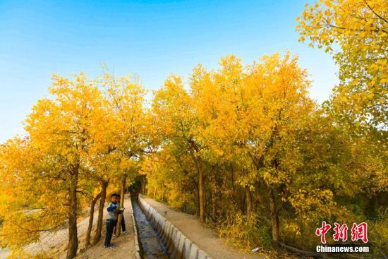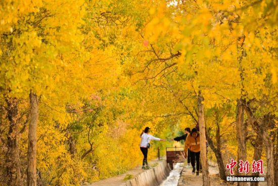 圖為胡楊秋色吸引不少游客和敦煌市民前來賞秋。 王斌銀 攝