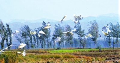 秋日的白銀天高云淡,風輕氣爽。隨著一年的稻田收割,成群的白鷺和野鴨等鳥類棲息在景泰縣五佛鄉(xiāng)成片的稻田、魚塘附近,或低空飛翔,或嬉戲覓食,形成一幅自然和諧的美麗畫卷?!?/p>